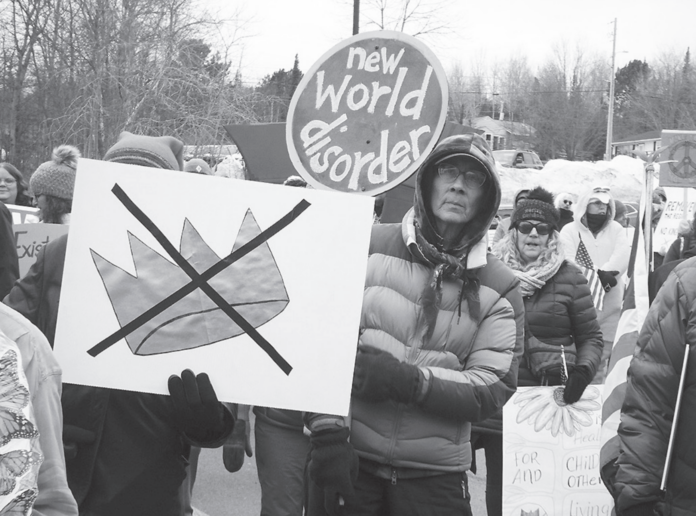 In Grand Marais, it is estimated that over 400 protesters gathered at the Cook County Courthouse with signs and spirit in spite of cold temperatures and snow. After a program of speeches, songs, and chants, they marched through blizzard-like conditions to the harbor, where the snow abated and the program continued.