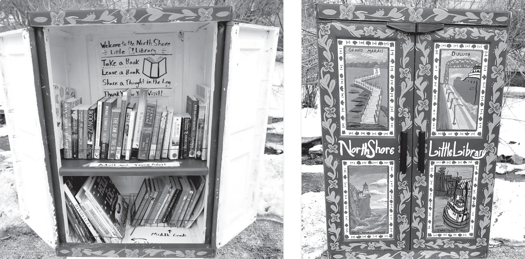 When she found a free cabinet from a fellow in Duluth, she finally saw her idea becoming a reality. But before filling it with books, Erdmann — a talented artist — wanted to tailor the cabinet to the North Shore. The result, standing on 6th Avenue across from the community garden, is truly a work of art.
