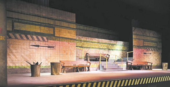 The set pictured (above) is the “clean” look before Prop Master John Kohlstedt added set pieces, sometimes purposely messy, all over scenic designer Ann Gumpper’s creation of a mysterious subway station in a mysterious location. Kelley tag artist Atlas Lincoln will work his magic on the walls of the set for pre-show audience members to watch.