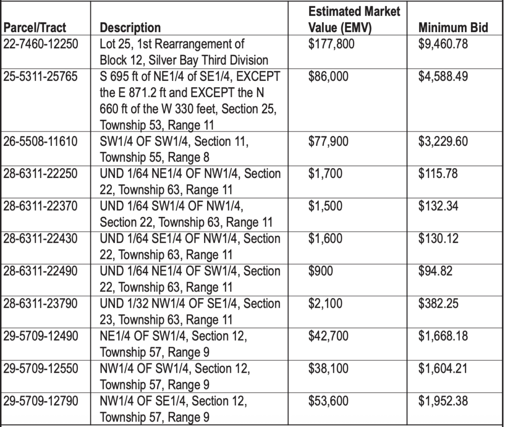 NOTICE IS HEREBY GIVEN, the following described parcels of land forfeited to the State of MN for nonpayment of taxes have been classified and appraised as provided by law, and such parcels shall be sold on the following terms, to sit: All listed properties will be offered for sale to the highest bidder at online auction in two auction periods. Properties will be first offered at an Estimated Market Value (EMV) Auction for no less than the estimated market value as determined by the most recent assessment for a period of 30 days. Unsold tracts will be subsequently offered at a Minimum Bid Auction for no less than the sum of delinquent taxes, special assessments, penalties, interest, and costs assigned to the parcel for a period of 15 days. Property must be sold at no lower than the value specified for the tract number listed for each auction, and bidding will begin at said value for each tract. The county reserves the right to reject any or all bids and to reject any bidder who has defaulted on a land sale contract or is a prohibited bidder as defined in the Terms and Conditions of Sale. Lake County may pursue all legal remedies allowed by law against any bidder who fails to make payment for a winning bid.