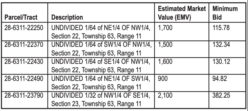 NOTICE IS HEREBY GIVEN, the following described parcels of land forfeited to the State of MN for nonpayment of taxes have been classified and appraised as provided by law, and such parcels shall be sold on the following terms, to wit: All listed properties will be offered for sale to the highest bidder at public auction in two auction periods. Properties will first be offered at an Estimated Market Value (EMV) Auction for no less than the estimated market value as determined by the most recent assessment. Properties unsold after the EMV Auction may be purchased at not less than the estimated market value in the Office of the County Auditor for a period of 30 days. Tracts remaining unsold after the 30-day period will be subsequently offered at a Minimum Bid Auction for no less than the sum of delinquent taxes, special assessments, penalties, interest, and costs assigned to the parcel. Property must be sold at no lower than the value specified for the tract number listed for each auction, and bidding will begin at said value for each tract. The county reserves the right to reject any or all bids and to reject any bidder who has defaulted on a land sale contract or is a prohibited bidder as defined in the Terms and Conditions of Sale. Lake County may pursue all legal remedies allowed by law against any bidder who fails to make payment for a winning bid.