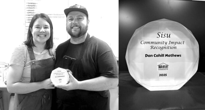 The first-ever SiSu Community Impact Award was presented to Dan Cahill Mathews. Dan has been an active community member and part of the Finland Food Chain since 2020/2021. This year marks his fifth year of coordinating and cooking for the festival, with help from his wife, Kaylee, the Finland Food Chain, and many other volunteers. Dan has been a board member of the Finland Co-op and coordinated the area’s food box/share program. He and his wife are also vendors at the Finland Farmer’s Market and own Baptism River BBQ Co. Dan is currently the chef for the monthly senior lunches held at the Clair Nelson Center by NSAP. He and his wife, Kaylee, regularly volunteer their time at various events on the North Shore, especially in Finland and Beaver Bay. Congratulations, Dan, on this well-deserved recognition!